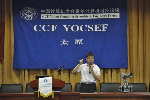 第二位讲者CCF YOCSE太原前任主席、中北大学计算机与控制工程学院秦品乐副教授为大家做了题为《机器手臂运动与视觉三维测量》的学术报告,报告通过实物、录像及数据分析多种手段展现了运用机器手臂运动辅助三位测量的优势,同时秦老师用幽默诙谐的口吻为大家讲解了科研科技中线性代数、概率论与数理统计的重要性。