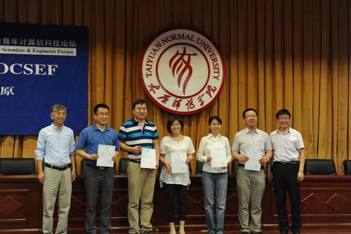 会议第二部分为YOCSEF太原2015-2016换届仪式,由郑祥峰主持。首先由CCF YOCSE太原第一任主席太原理工大学强彦教授为新任主席团颁发聘任证书,他们是山西思软科技有限公司总经理、太原师范学院赵鹏副教授(主席)、山西省软件行业协会副秘书长雷登斌(副主席)、太原理工大学信息学院陈泽华教授(副主席)、山西财经大学信息学院吕亚丽教授(副主席)、山西大学软件学院领导组成员郭威(学术秘书),大家用热烈的掌声欢迎新任主席团上任。