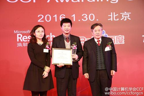 CCF第十届理事长郑纬民与百度公司赵世奇博士为青年科学家获奖者颁奖