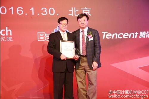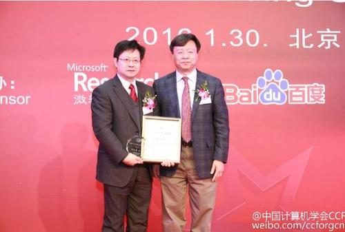 CCF第十届理事长郑纬民与百度公司赵世奇博士为青年科学家获奖者颁奖