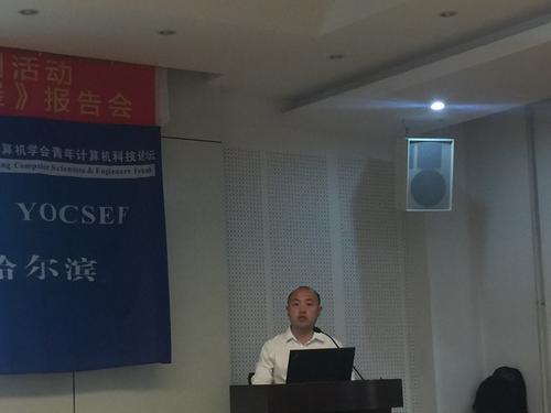 大会第一阶段是两个精彩的产学研报告活动。报告由YOCSEF哈尔滨候任副主席保鑫主持。执行主席为保鑫和AC委员景维鹏。上午9点30分,由来自北京神州云动科技股份有限公司的闫术首先带来了题为“破解SaaS信息化之谜”的演讲。闫术博士首先以一段介绍SaaS的视频开始,引入平台实现的功能。然后以天津某造纸厂作为案例,展示公司应用SaaS软件后效益的提高。最后,闫术博士介绍了SaaS信息化的发展历史、研究现状和技术类型。