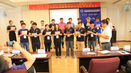 2017年6月18日在哈尔滨工业大学活动中心331会议室,中国计算机学会青年计算机科技论坛(CCF YOCSEF)哈尔滨分论坛换届大会隆重举行,同期还举办了题为“计算机应用推动SaaS模式与市场营销协同发展”的产学研报告会、题为“移动边缘计算及其在车联网中的应用”的学术报告会。中科云海的鹿泽光正式接棒CCF YOCSEF 哈尔滨2017-2018主席。YOCSEF总部AC委员林俊宇、邬向前、祝烈煌、上海分论坛AC委员薛建新、齐国峰、天津分论坛AC委员董永峰、郑州分论坛主席贾丹丹、青岛分论坛主席王胜科、大连分论坛主席王新年、AC委员孙伟、沈阳分论坛主席冯勇、AC委员邵华、长春分论坛主席张永刚、副主席赵剑、AC委员宋小华、宋小龙、孙铭会等应邀出席了本次会议。CCF YOCSEF哈尔滨主席车万翔、副主席陈婷婷、邱兆文、AC委员保鑫、桑艳娟、冯光升、高辉、韩启龙、韩琦、景维鹏、李晓坤、马吉权、潘海为、宋显华、张英涛、张茹、张宇、周长建、候任AC委员宋洪涛、谢巍、张立国、赵国生和委员孙艳庆等参加了会议。