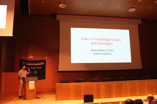 澳大利亚格里菲斯大学王克文教授是该校人工智能与语义技术实验室主任,是国际人工智能知识表示领域的知名学者。他的报告“知识图谱和本体中的规则”介绍了知识图谱中的规则抽取,集中讨论了如何将AI中的Abduction推理用于形式化OBDA中的查询解释问题,并基于Datalog技术设计高效算法。由此实现的查询解释系统ABEL可以处理超过十万个RDF三元组的本体知识库。