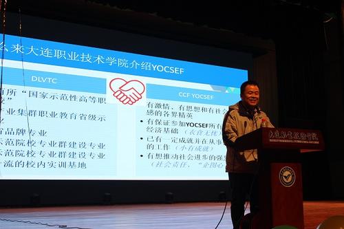 CCF YOCSEF 副主席烈煌向大家讲述了YOCSEF的使命、口号、组织结构和成员职责等。YOCSEF大连主席新年介绍了YOCSEF大连的历史、目标、历任主席和优秀代表、特色活动和委员条件等。在场的师生对YOCSEF有了直观的了解,增强了YOCSEF在高职院校的影响力。