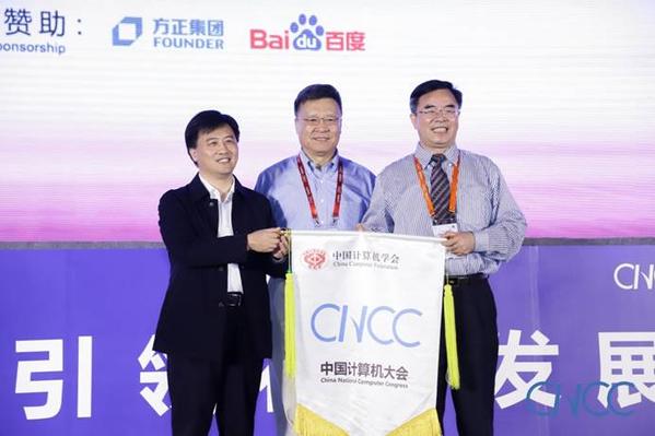 授旗仪式(左一CNCC2019举办地苏州市代表,左二CCF理事长高文,右一CNCC2020举办地深圳市代表)