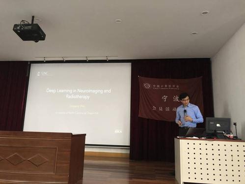 会议邀请了北卡罗莱纳大学教堂分校放射学、生物医学研究成像中心、计算机科学和生物医学工程的杰出研究员——沈定刚教授作了题为《神经成像和放射治疗中的深度学习技术(Deep Learning in Neuroimaging and Radiotherapy)》的专题报告。报告中,沈教授介绍了计算机辅助技术在医学影像中的应用,重点研究内容包括婴儿孤独症的早期诊断、老年痴呆症早期诊断的自动测量方法、脑肿瘤患者术后生存时间的预测系统等几个方面,并通过机器学习和深度学习方法,针对上述几个内容得到了比较准确的结果。