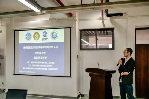 福建工程学院信息科学与工程学院硕士生导师刘石坚教授报告主题为“医疗智能三维建模与手术规划平台-E3D”。刘教授研究方向是计算机图形学、三维网格/医学图像处理以及虚拟现实与增强现实(VR/AR)、条码技术、医学生物信息处理等。