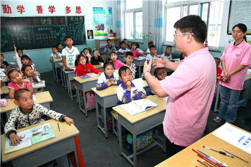 CCF吕梁教育扶贫团志愿者韩银和、陈泽华为明德小学学生讲课