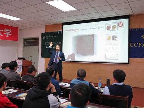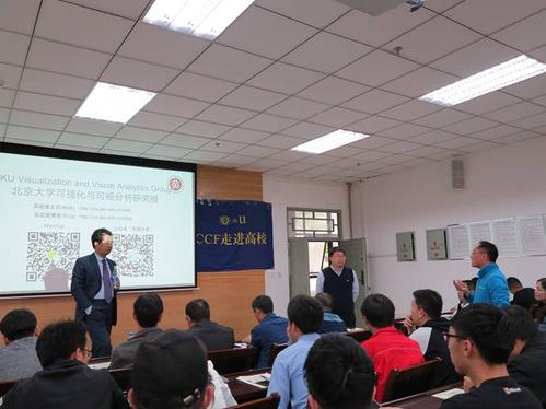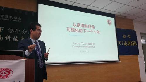 活动开始,CCF西南科技大学学生分会执行委员会主任吴亚东老师向会者介绍了袁晓如以及他在可视化领域相关工作及贡献。随之袁晓如展开了主题为“从易用到自动——可视化的下一个十年”的报告。