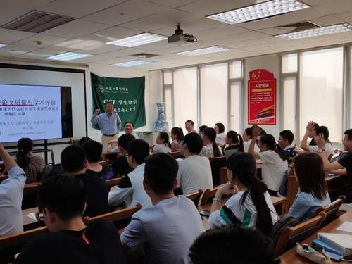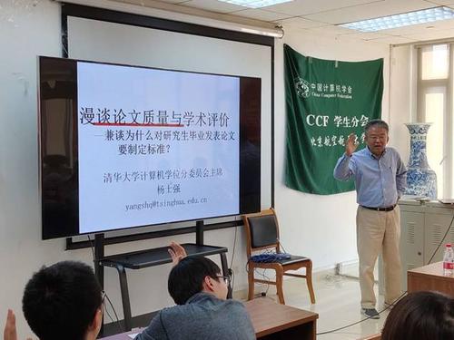 杨老师演讲的报告主题为《漫谈论文质量与学术评价—兼谈为什么对研究生毕业发表论文要制定标准》。活动开始前,同学们早早已来到会场,井然有序地入场、签到、落座。会场座无虚席,有些同学只能站着听完讲座。杨老师虽然年事已高,但是精神矍铄,声音洪亮,思路清晰。讲座以“研究生如何展开学术研究,进行学术写作”为题展开。杨老师为我们指明的科研目标是:大家都没有论文时,先做到有;都有时,比谁好;都好时,比谁亮。他还以清华为例分析了国内大学的科研现状,并分享了他带领清华计算机学科学术建设的心得体会。最后的问答环节中,杨老师为同学们亲切地解答研究生生涯的各类问题,指引同学们走向正确的方向。
